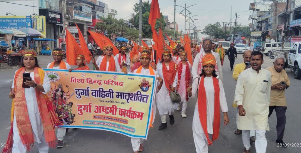 बाराबंकी। विश्व हिंदू परिषद दुर्गा वाहिनी मातृशक्ति के तत्वाधान में दुर्गा अष्टमी कार्यक्रम जिला कोऑपरेटिव बैंक के सभागार में रविवार को संपन्न हुआ। दुर्गा वाहिनी पूर्वी उत्तर प्रदेश के क्षेत्र संयोजिका कल्पना,साध्वी श्रद्धा चैतन्य,दुर्गा वाहिनी प्रांत संयोजिका डॉ मुद्रा एवं जिला बाल कल्याण समिति अध्यक्ष बाला चतुर्वेदी ने संयुक्त रूप से महिषासुर मर्दिनी के चित्र के सम्मुख दीप प्रज्वलित कर कार्यक्रम का शुभारम्भ किया। दुर्गा सप्तशती दुर्गा चालीसा के साथ ही शस्त्र पूजन भी किया गया।
