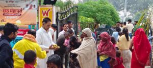 व्रती महिलाओं को प्रसाद वितरित करते नगर अध्यक्ष रामशरण पाठक