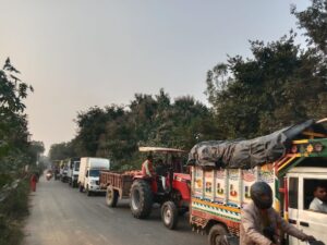 रामनगर बाराबंकी।रेलवे ओवरब्रिज से रेलवे ट्रैक पर गिरे डंपर हादसे के बाद रेल प्रशासन हरकत में आया भारी वाहनों के आवागमन को रोकने के लिए हाइट गेज तथा पुल के किनारों पर बैरिकेटिंग व जाल लगाने का कार्य शुरू कर दिया। कार्य के चलते बुधवार को भयंकर जाम लग रहा वनवे से वाहन निकाल जा रहे थे। ज्ञात हो कि 26 नवम्बर की रात्रि करीब 9:30 बजे प्लाई लाद करके रामनगर की तरफ आ रहा डंफर जब अगानपुर गाँव के पास स्थित रेलवे ओवर ब्रिज से गुजर रहा था तो असंतुलित हो जाने के चलते नीचे रेलवे ट्रैक पर गिर गया था जिसके चलते रेल यातायात बाधित हुआ था लेकिन कोई जनहानि नहीं हुई थी। हादसे में गंभीर रूप से घायल चालक के विरुद्ध रेलवे पुलिस द्वारा मुकदमा दर्ज कर लिया गया था जबकि क्षेत्रीय लोगों का कहना है कि पुल के निर्माण व मानकों में लापरवाही बरतने वाले जिम्मेदार अधिकारियों के खिलाफ कोई कार्रवाई नहीं की गई थी यह लोगों में चर्चा का विषय बना हुआ है। हादसे के बाद रेल प्रशासन की कुंभकर्णी नींद टूटी तो आनन फानन में दुर्घटनाओं की रोकथाम के लिए पुल के किनारे टीन की बैरिकेटिंग लगाई गई आज बुधवार को पुराने पुल के किनारों पर सुरक्षा हेतु जाल लगाने का कार्य किया जा रहा है। इस मार्ग पर भारी वाहनों के आवागमन पर रोक लगाने के लिए पुल के दोनों ओर हाइट गेज लगाने का कार्य चल रहा है। पुल पर चल रहे कार्य के चलते कई दिनों से लोग जाम से परेशान हैं आज भी भीषण जाम लगा हुआ था लोग घंटो जाम की जाम से जूझ रहे थे रेलवे कर्मचारियों के द्वारा वनवे साइड से वाहनों को निकलवाया जा रहा था।