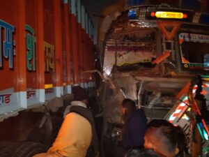 गोण्डा-बहराइच राष्ट्रीय राजमार्ग पर स्थित मसौली पशु बाजार के पास शुक्रवार की देर शाम दो ट्रकों की आमने-सामने जोरदार टक्कर हो गई। इसी दौरान पीछे से आ रही एक कार ट्रक में जा घुसी। हादसे में कार सवार चारों लोग सुरक्षित रहे, जबकि एक ट्रक का चालक और खलासी आंशिक रूप से घायल हो गए।जानकारी के अनुसार, बाराबंकी की ओर से आ रही ट्रक सामने से जा रही ट्रक में जोरदार टक्कर हो गई। टक्कर के बाद बाराबंकी से रामनगर की ओर जा रही एक कार ट्रक के पीछे घुस गई, जिससे कार क्षतिग्रस्त हो गई।हादसे में ट्रक चालक तिलकराम पुत्र शंकर और खलासी महादेवराज पुत्र राम अचल, निवासी हीरापुर कमियार, कोतवाली करनैलगंज जनपद गोण्डा घायल हो गए। दोनों को एंबुलेंस की सहायता से सामुदायिक स्वास्थ्य केंद्र बड़ागांव पहुंचाया गया, जहां प्राथमिक उपचार के बाद जिला अस्पताल रेफर कर दिया गया।वहीं दूसरे ट्रक का चालक सूरज पुत्र रिखाई यादव, निवासी जनपद संत कबीर नगर, थाना दुधवारा, नशे की हालत में पाया गया। पुलिस ने उसे मौके से हिरासत में ले लिया है। मामले में पुलिस आवश्यक कार्रवाई कर रही है।